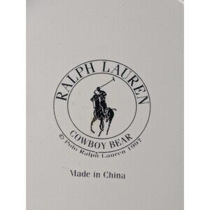 Authentic Ralph Lauren Cowboy Bear ceramic coffee mug featuring the iconic Polo Bear in a western-inspired outfit. Clean white ceramic with a glossy finish and official Ralph Lauren Cowboy Bear backstamp dated 1997. A desirable collectible for Polo Bear fans or a stylish everyday mug. Pre-owned with light surface wear from normal use; chip on bottom ring and some wear inside cup. Displays well and is fully functional.
