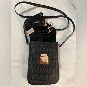 NWOT stylish black crossbody bag featuring a gold accent. Perfect for any occasion.