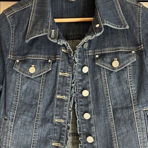 Chic dark blue denim jacket by WHBM classic button-up design and stylish stitching. Features a ruffle trim, fitted, silhouette, and rhinestones on the pockets. Wonderful preowned condition no flaws. 99% cotton, 1% spandex. Measurements laid flat: