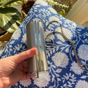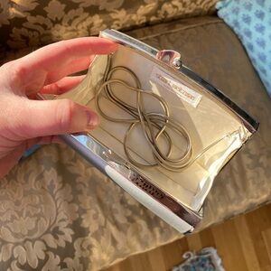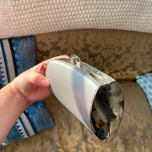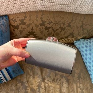 Vintage Stuart Weitzman Silver Satin Minaudière / Box Clutch w Removable Chain