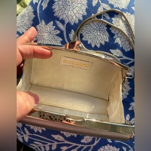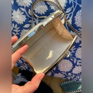 Super cute evening bag with a structured box silhouette and luxe metallic silver satin finish. Great vintage condition. Snap closure is strong and secure. Made in Spain. Can be worn as a shoulder bag/crossbody with the chain strap or carried as a clutch.