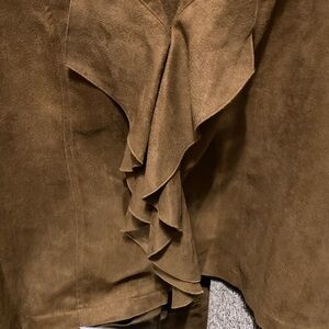 Stylish brown blazer with ruffle detail. Ideal for any occasion.