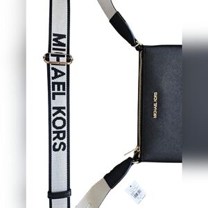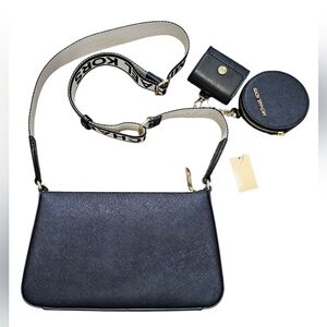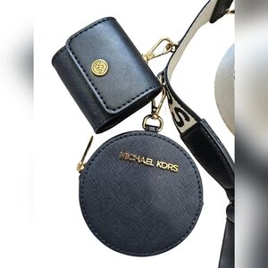 NEW WITH TAGS! Stylish black leather crossbody bag set by Michael Kors. Strap has Michael Kors' name and includes matching small wallet and coin pouch. Elegant gold accents.
