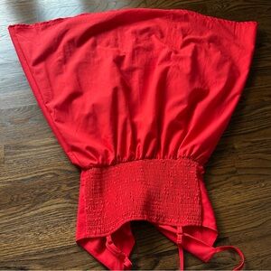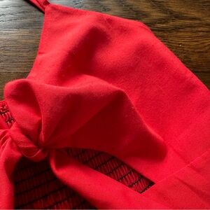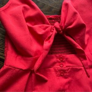 Stylish red sleeveless dress with button-down front and bow detail. Perfect for any occasion.