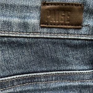 Hoxton Crop Slim Jeans by PAIGE in dark blue denim with a raw hem. Comfortable fit with the brand’s TRANSCEND stretch denim.
