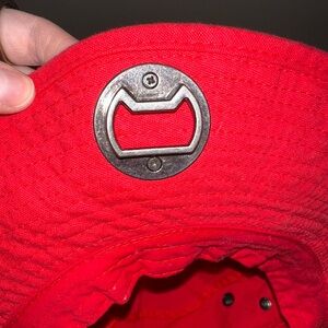 Coca-Cola bucket hat with a bottle opener attachment and an adjustable string