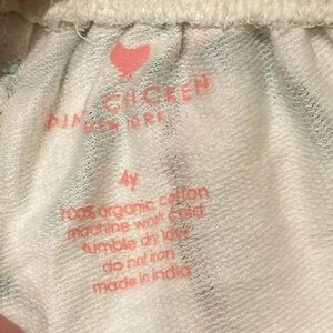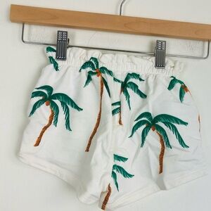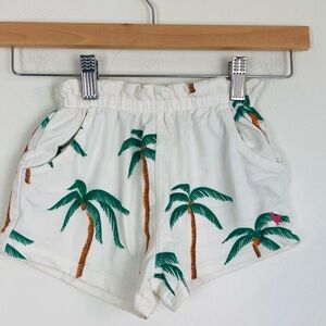 Pink Chicken white shorts. Green and brown palm tree print. Elastic waist. Front pockets. Organic cotton. Size 4Y.