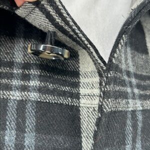 Stylish black and white plaid coat with button closure. Perfect for a chic look.