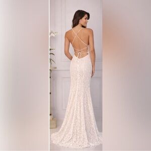 The adjustable lace-up back allows for a customizable fit through the waist and bust, offering a flattering and secure feel. The floral lace creates a feminine look, while the open back with crisscross straps adds a contemporary bridal touch. A subtle lace train completes the design, making this gown ideal for garden weddings, estate venues, romantic ceremonies, or elegant indoor celebrations.