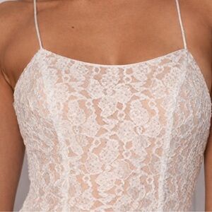 This gown has been displayed in a retail boutique and may have been tried on. Lace fabrics naturally develop light surface texture from handling and display, which does not affect wear or overall appearance when worn. No tears, snags, or stains observed.