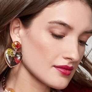 Lele Sadoughi Dried Floral Heart-Shaped Resin Earrings Beautiful heart-shaped earrings with embedded dried floral design. Appx 2” long, Features red and gold tones in clear resin. Rare to find in new condition! Comes with the dust bag and card.
