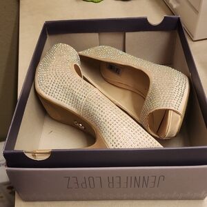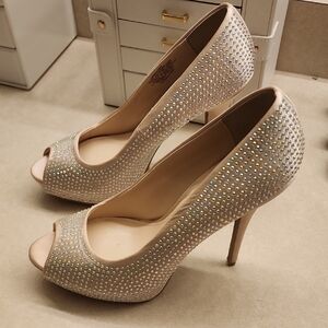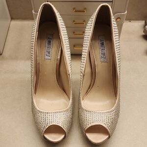 Step out in style with these stunning rhinestone peep-toe heels. Perfect for any special occasion, these shoes feature a shimmering design that catches the light beautifully. Satin heel and gold touches. The elegant cream color adds a touch of sophistication to your outfit. Never worn, all rhinestones are intact.