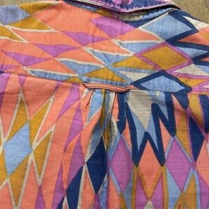 Vintage 100% cotton button down shirt made in India. Aztec geometric pattern in a colorful mix. Size M. Oversized fit. Excellent condition, next to lowest button missing.