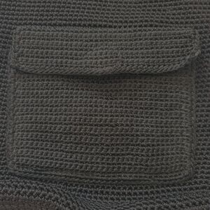 The Sak Black Crochet Long Crossbody Strap Shoulder Zip Purse is a medium-sized, square-shaped shoulder bag made of black nylon with silver hardware accents. It features a zip closure and a black crochet exterior, with a woven pattern and matte finish. This vintage-inspired purse is lightweight, packable, and eco-friendly, perfect for travel or casual occasions. The bag also includes inner and outer pockets, a lined interior, and a bag charm accessory, adding to its functionality and style. With a hand-crochet design and hippie, boho character, this purse is a unique and versatile addition to any woman's wardrobe.