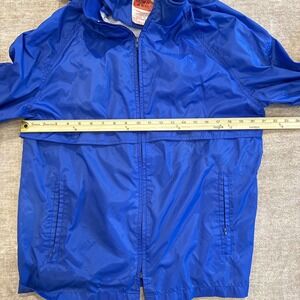 STOW IT A WAY blue nylon hooded windbreaker jacket. This lightweight jacket offers a convenient packable design, making it perfect for on-the-go. It features a full zip front, two zippered hand pockets, and a drawstring hem for adjustable fit. The attached hood provides extra protection from the elements. Ideal for travel, outdoor activities, or casual everyday wear.