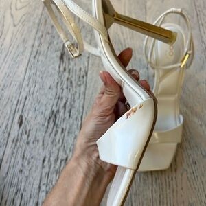 Chic Aldo heels with a sleek cream strap. Gold accent on the heel adds elegance. Ideal for elevating any outfit.