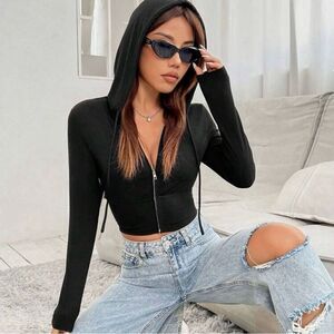 SHEIN PETITE Zip Up Drawstring Crop Hoodie Black / Petite L(8/10)