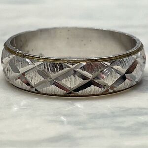 Beautiful silver-tone Brass band ring with a bold diamond-cut / engraved geometric pattern that catches the light and sparkles like faceted metal. This ring was used as a jewelry store sample ring, making it a unique piece for collectors or anyone who loves statement jewelry.