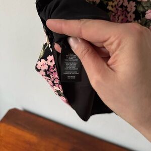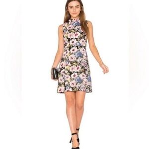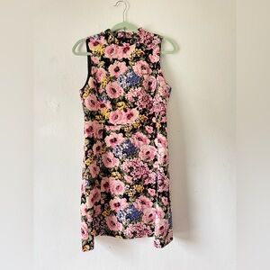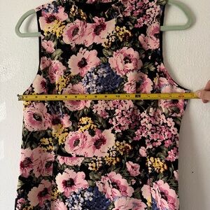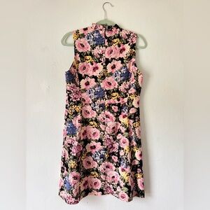 Elegant mini dress with a bold floral design. Features a sleeveless cut and high ruffle neckline. No visible flaws.