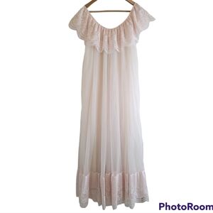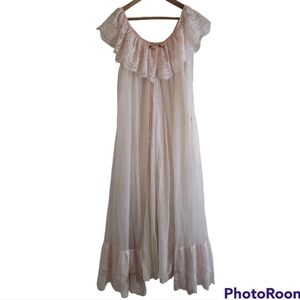 Vintage Peignoir Set Intime White Pink Long 2-piece Robe Nightgown Chiffon Lace
