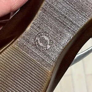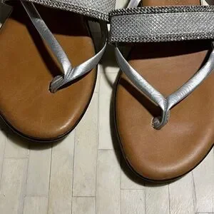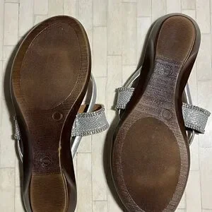 Silver straps with a touch of sparkle through metallic silver straps and crystals across the foot. Comfortable brown footbed. These are rehab or project sandals due to the missing crystals at the top. Great for someone to add more crystals or revamp the top strap.