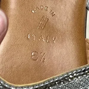 Excellent Used Condition, Cosmetic Flaws Only. A bunch of the crystals at the top are missing. Some light scratches on the footbed. Otherwise, all stitching is in place and the straps are in great condition.