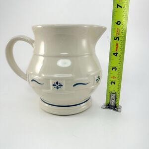 Vintage Longaberger Pottery pitcher and gravy boat set in the classic Woven Traditions pattern with blue accents. Made in the USA, this matching set features Longabergers signature cream-colored stoneware with hand-applied blue floral and wave detailing.