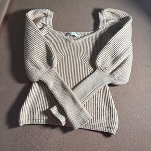 This tan V-neck sweater from Astr features a ribbed knit texture and stylish puff sleeves, offering a chic and comfortable fit. Its versatile design makes it a perfect addition to any wardrobe, providing both elegance and warmth.