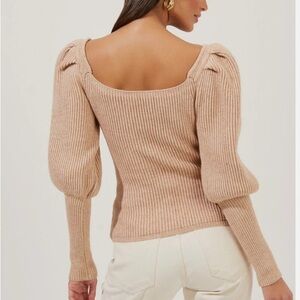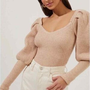 Astr Tan V-Neck Sweater with Puff Sleeves