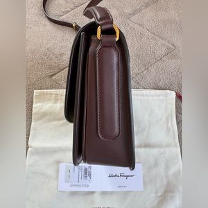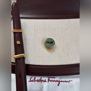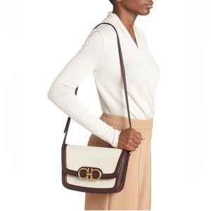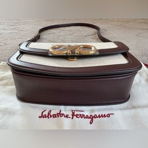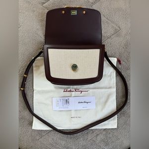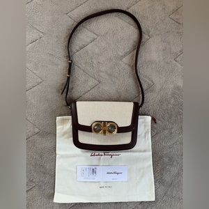 NEWš„FERRAGAMO Trapezio Canvas & Leather Crossbody Bagš„authentic, brand new, never used, color naturale/ganache brown, size 7"W x 6"H x 2"D (16ā-19ā strap drop), comes with original dust bag and loose tag.