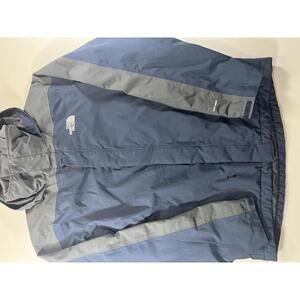 This North Face jacket features DryVent technology for waterproof and breathable protection. It has a two-tone blue and gray color scheme with a hood and adjustable cuffs. Ideal for outdoor activities and everyday wear, providing comfort and durability.