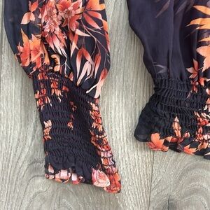 Elegant women's top featuring a vibrant floral design by the brand Warm. Perfect for adding a touch of color to your wardrobe. Sheer fabric with necktie. Waist and cuffs have cinched elastic for elegant fit. Pit to pit is 25". 100% viscose. Made in the USA with imported materials. Estimating a size Medium. EUC.