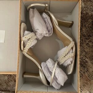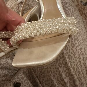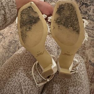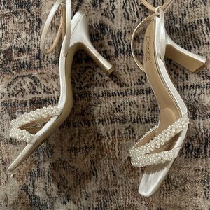 Chic white heels with pearl-adorned straps. Worn on wedding day! Very comfortable. You can tell some wear on heels but in great condition for another bride at half the cost.