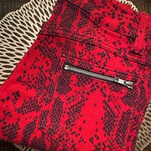 Stylish red pants with a bold black snake print. Features a zipper pocket detail.