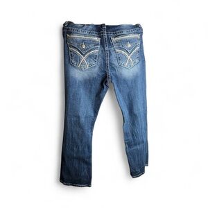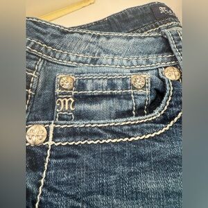Classic Miss Me jeans in a flattering low-rise bootcut style with iconic embroidered flap pockets and crystal rivet details. Medium wash with light fading and whiskering for that signature Miss Me look. Perfect blend of western charm and everyday wear.