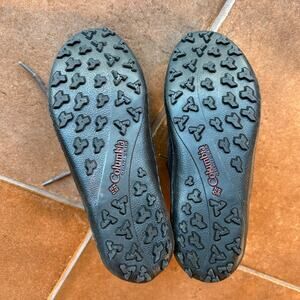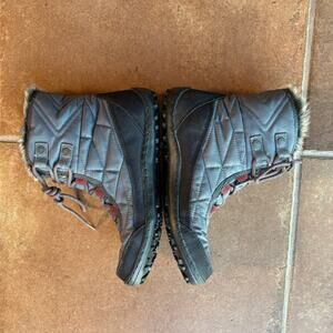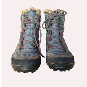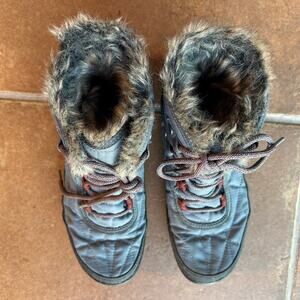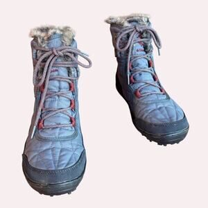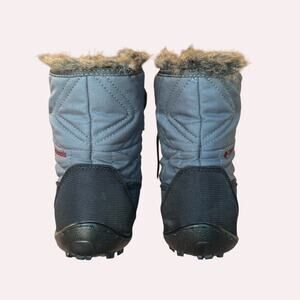 Columbia booties in very good condition without a lot of wear, and just a few minor scruffs on the outside. The interiors and soles are clean, and the fur is fresh with no matting. These are great little lightweight, flexible snow booties that have a lot of nice features including a quilted, waterproof exterior, insulated lining that protects against temps as low as -25F, and grippy soles. Their color is a bluish grey.