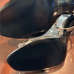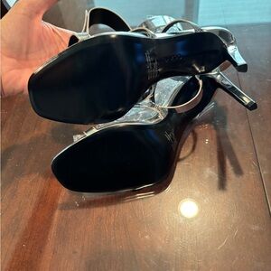 Chic and modern metallic silver heels. Strappy design with a sleek finish. Ideal for evening wear. Mad made materials. Heel is 4.5”. Top strap is Velcro. Never worn, new without box. Last picture is shoe in white for example.