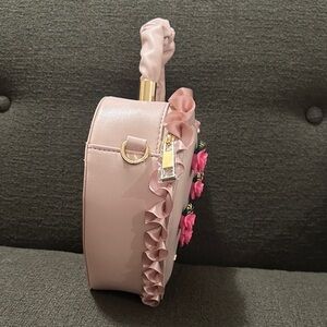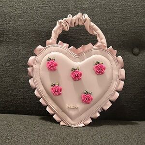 Charming heart-shaped bag by Aldo. Adorned with pink floral accents and ruffled trim. Perfect for adding a touch of romance.