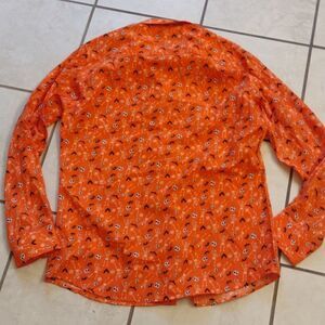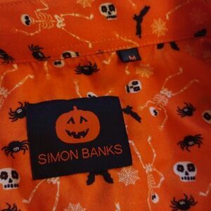 New without tag Simon Banks Halloween buttondown longsleeve shirt orange skeleton, skulls, bats, and spiders print. Size M please see measurements pictures to be sure of fit.