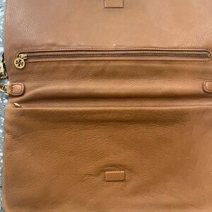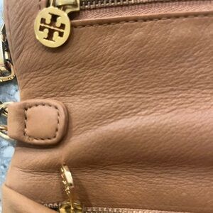 Elegant Tory Burch clutch in black with tan accents. Features embossed pattern and chain strap. Excellent condition