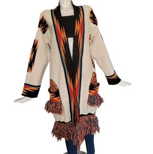 Thiz open front cardigan features a unique combination of leopards and contrast geometric patterns on a cream base.Shawl collar design, fringe at hem, patch pockets, and detachable Waist belt.