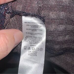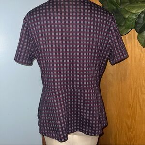 Ann Taylor women's peplum top in size XL. This stylish top features a square neckline and short sleeves. The fabric has a subtle plaid pattern in navy burgundy and white. Designed with a flattering peplum silhouette, this top offers a polished look.
