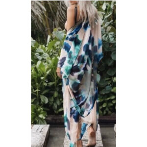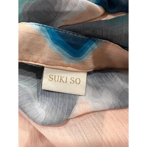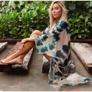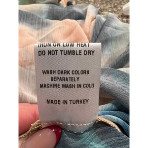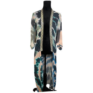 This pre-owned Suki So tie-dye kimono is a long, lightweight garment with a relaxed fit. The fabric appears to be silk or a silk blend, exhibiting a soft drape. The color pattern is a tie-dye design in shades of teal, blue, grey, and peach. It features three-quarter length sleeves and an open front. There is a gold-colored trim along the front placket. The approximate dimensions are not provided, but it appears to be approximately 50-55 inches in length. The kimono shows no significant flaws or damage; however, minor imperfections may be present due to pre-owned status. Care instructions indicate machine wash cold, wash dark colors separately, and iron on low heat. Do not tumble dry. Made in Turkey.