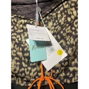 This striking Guess by Marciano top, size 46, captures the essence of wild elegance. The leopard print shimmers subtly, complemented by a vibrant orange tie and heart accent.