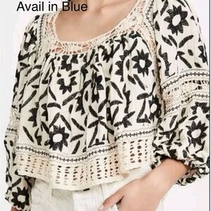 This cream with blue floral print top features a square neckline, crochet lace accents and 3/4 balloon sleeves. It’s made of a lightweight and breathable linen blend material. The style is cropped and oversized, with a collarless design and a relaxed fit, perfect for summer and spring occasions with a hippie and bohemian theme.