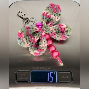 Hand crafted crochet butterfly bag charm keychain featuring pink acrylic beads and silver tone hardware.
