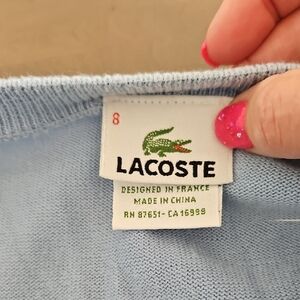 Stylish Lacoste sweater vest with argyle pattern. Features blue, green, and gray colors. Perfect for layering.