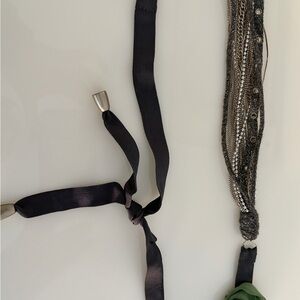 Chic multi-strand necklace. Black and silver hues. Features elegant ribbon accents.