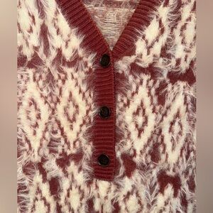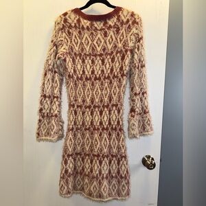 Cozy knit dress with long sleeves. Features a geometric pattern. Perfect for cool weather.