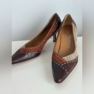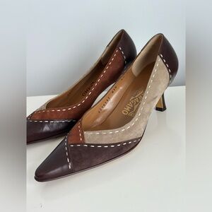 Step into timeless sophistication with these authentic Salvatore Ferragamo pumps. Featuring a unique color-block design in rich shades of brown, taupe, and caramel, these heels blend luxury leather and soft suede for an effortlessly chic look. The pointed toe and kitten heel add elegance and comfort — perfect for both professional wear and elevated everyday style.